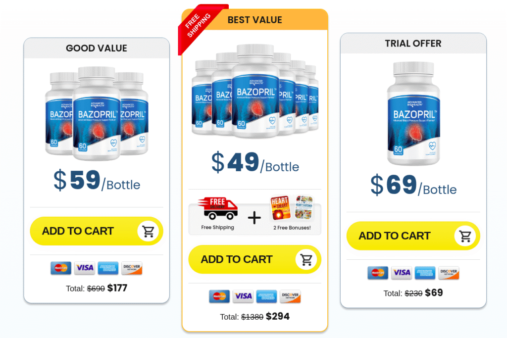 It’s simple! Just choose one of the packages below, click the “Buy Now” button, complete our secure checkout, and we’ll ship Bazopril directly to your door.